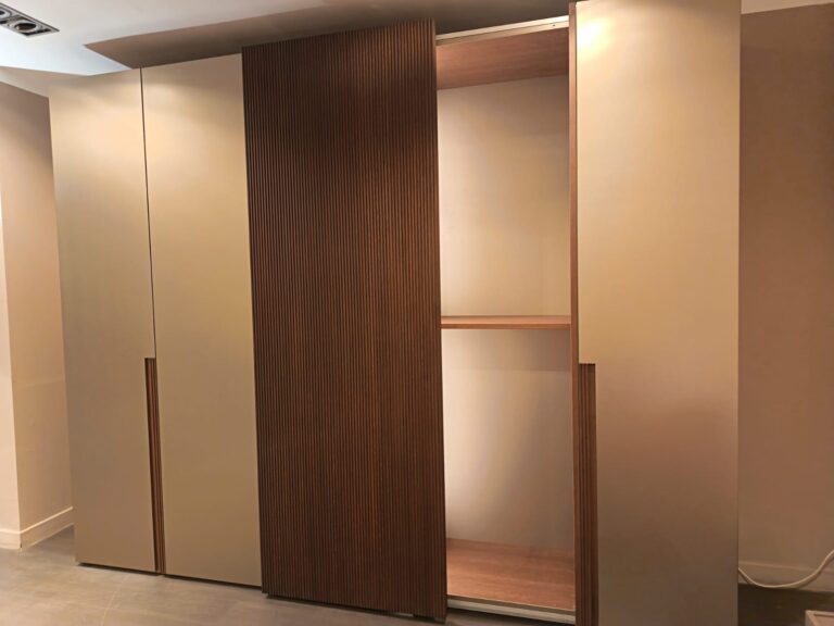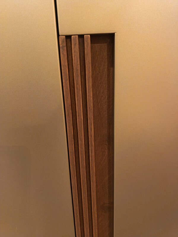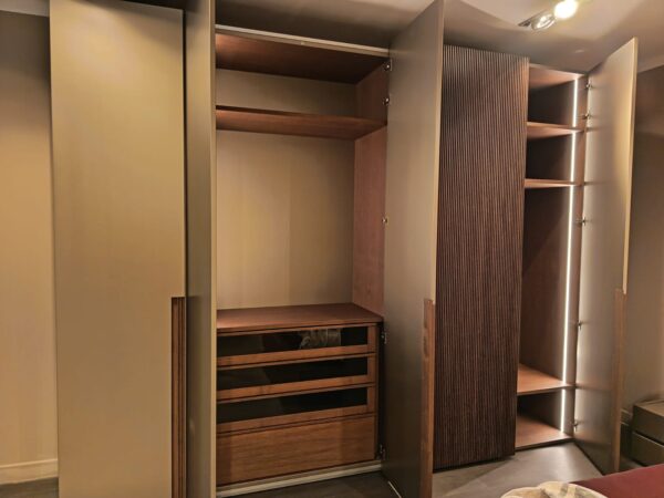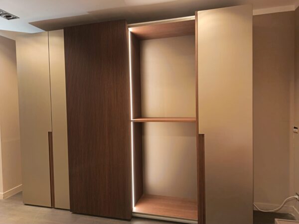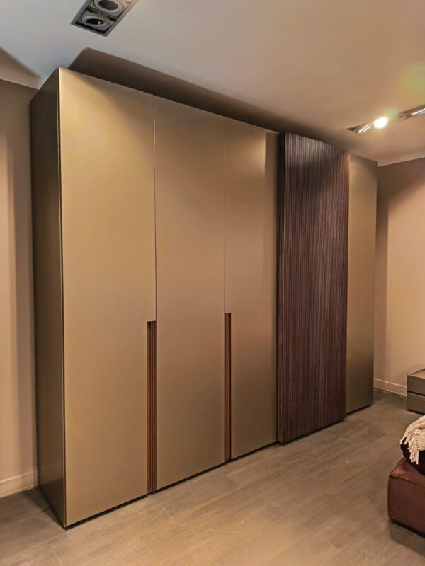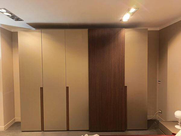 Armadio di nostra produzione, realizzato interamente in listellare, ante battenti laccato metalizzato e anta scorrevole cannettato in rovere tinto. Dotato internamente di cassettiera interna, led nei fianchi.