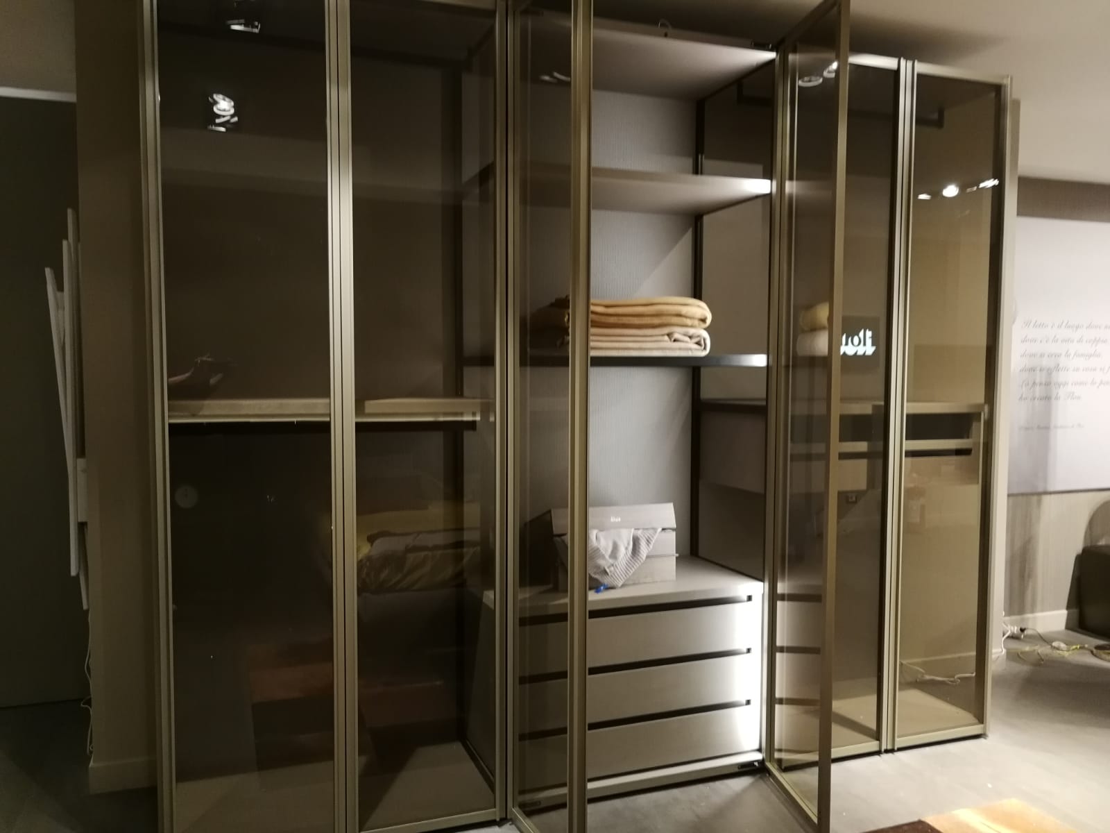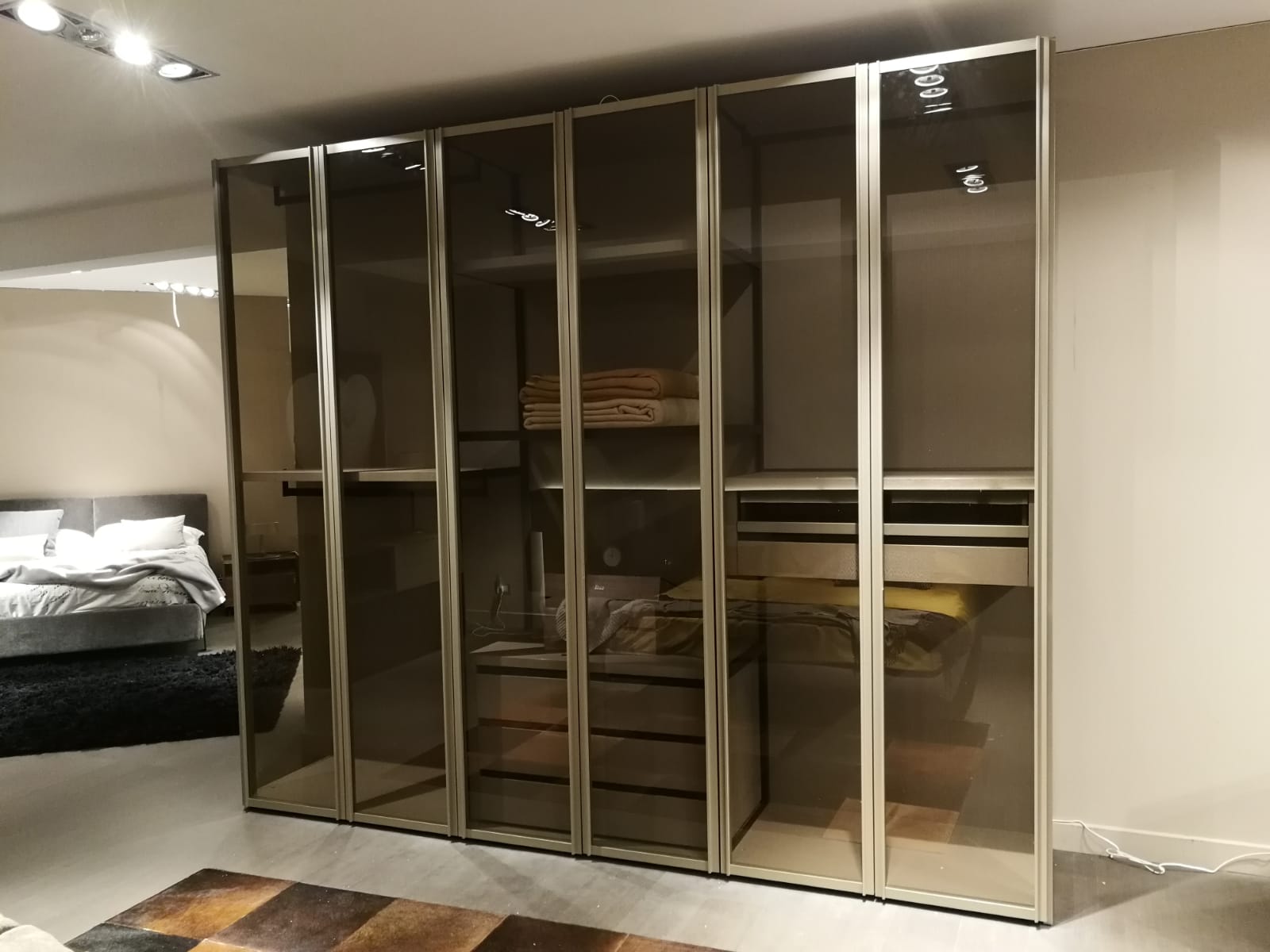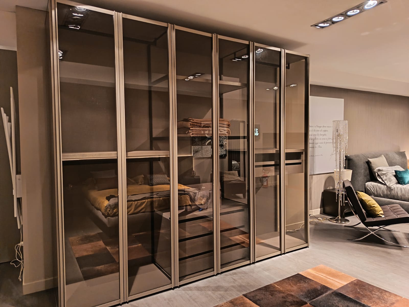 ante Scrigno battenti in vetro trasparente fumè e profili in metallo palladio