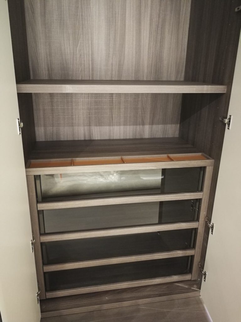 Interno in olmo materico scuro, cassetti interni in vetro trasparente fumè con svuotatasche