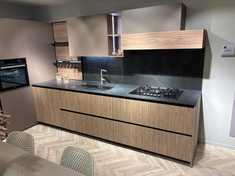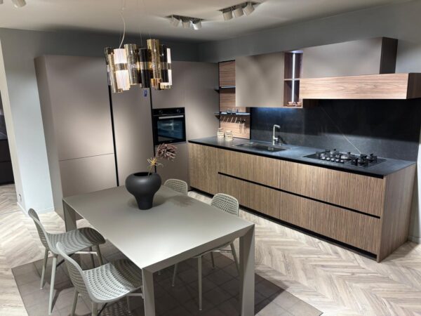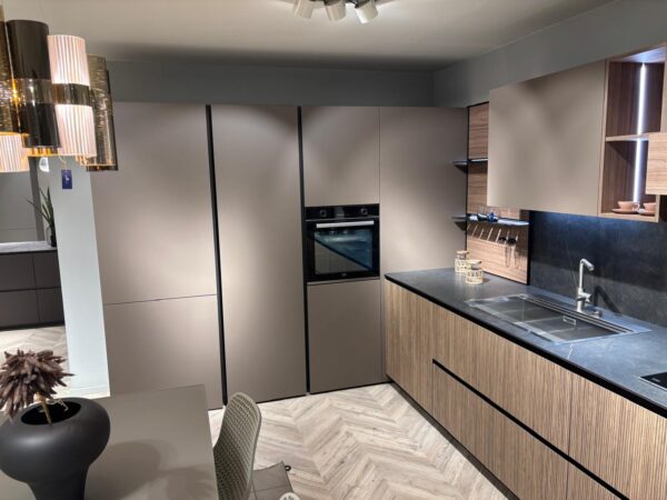 Cucina Stosa Metropolis angolare ante in pet caffè opaco e laminato noce onda, boiserie noce eucalipto