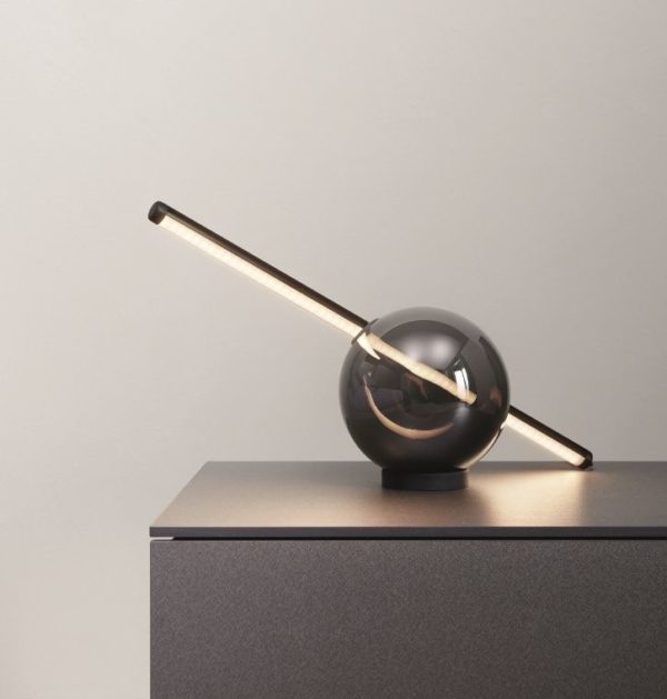 Lampada da tavolo con base sferica D. 16 realizzata in vetro soffiato fumè.
