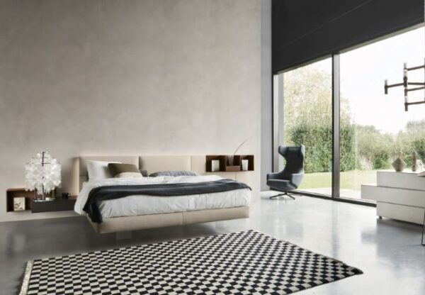 Sistema letto caratterizzato dalla testiera composta da pannelli boiserie imbottiti