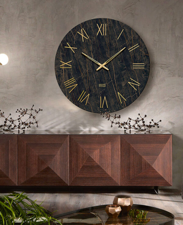 Orologio da muro realizzato in vetro serigrafato effetto marmo nella finitura lucida Noir Desir con logo serigrafato e lancette oro
