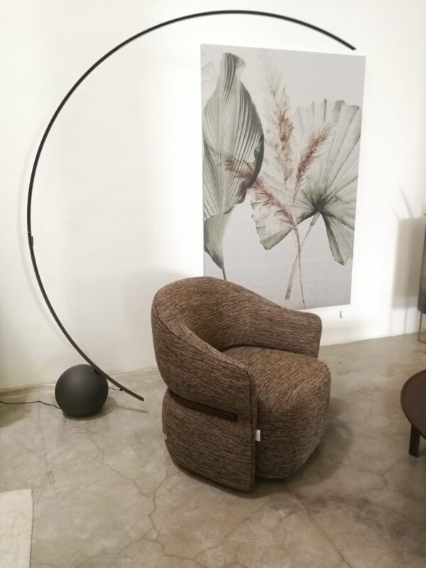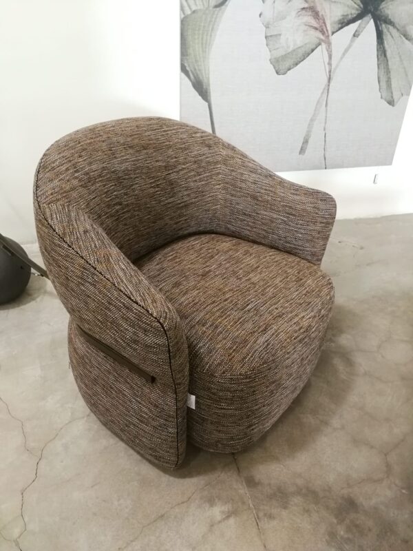 Dalla forma arrotondata, delicata e avvolgente che senza soluzione di continuità include seduta, braccioli e schienale, accoglie il corpo per farci sentire al sicuro. La morbidezza è sottolineata da un tubolare in finitura anodic bronze che racchiude e delimita la parte esterna di schienale e braccioli; un dettaglio identificativo di grande eleganza e armonia e di sicuro effetto decorativo.