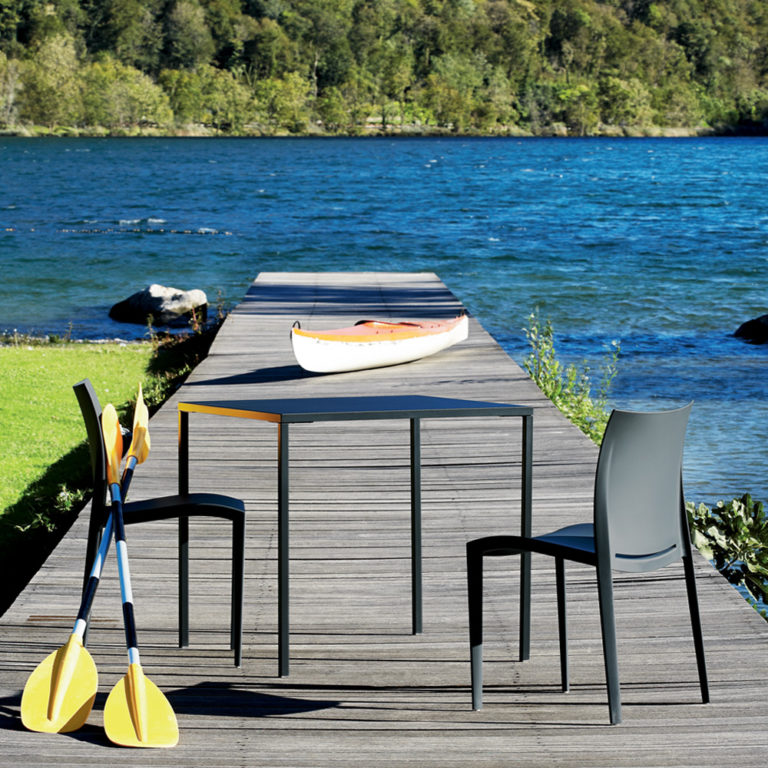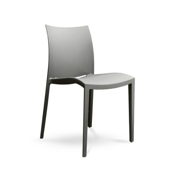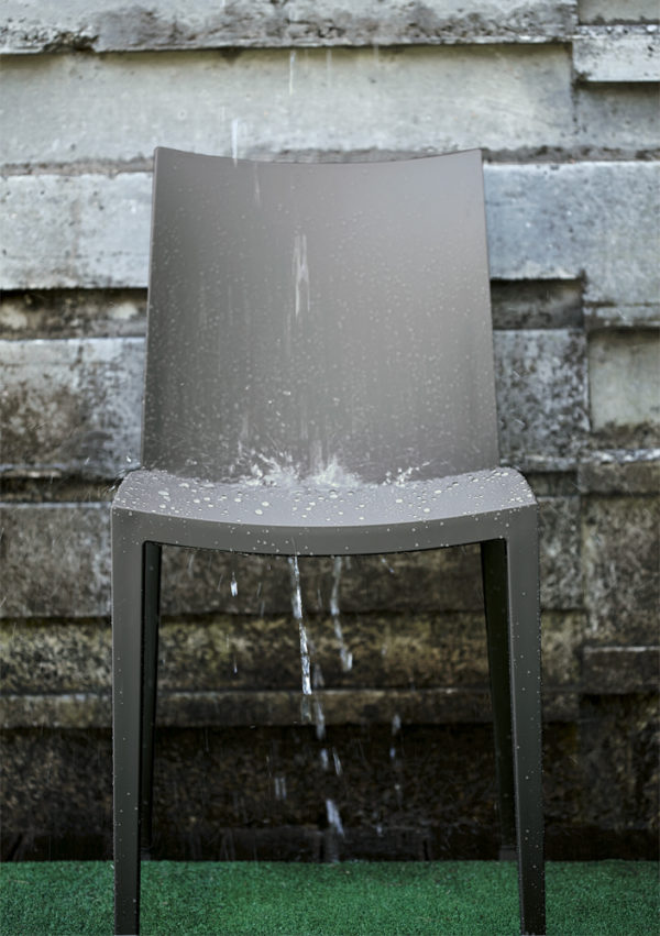 Realizzata in materiale riciclabile, la sedia è impilabile ed adatta ad uso esterno.