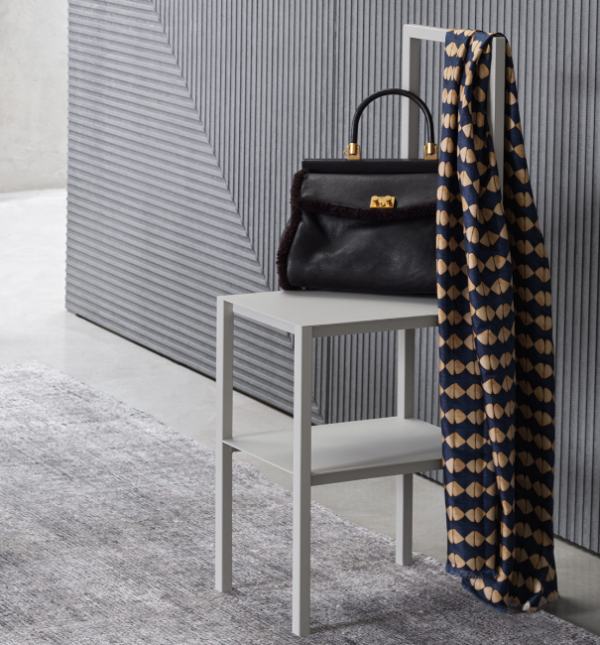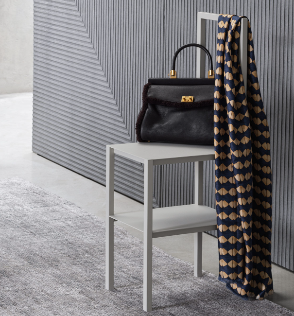 Servomuto con doppia funzione di sedia/appendiabiti, in acciaio di colore greige. Può essere completato da una copertura tessile imbottita: un “vestito” amovibile che ne segue e ridisegna le forme, realizzabile con tutti i tessuti della collezione di rivestimenti Flou.