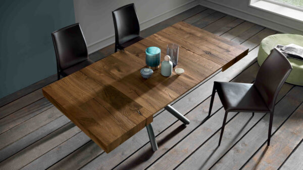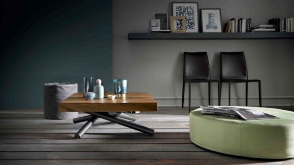 Tavolino Altacom mod. Levante trasformabile in tavolo da pranzo, meccanismo a gas, regolabile in altezza al millimetro da cm 36 a cm 75, piano quadrato con apertura sincronizzata con 2 prolunghe interne. Ruote a scomparsa.