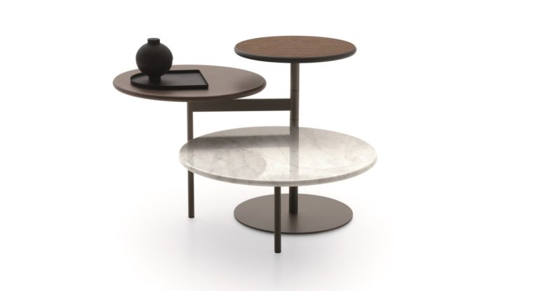 Il tavolino Tris è composto da tre piani tondi che grazie ad un meccanismo ruotano su se stessi lasciando un’estrema possibilità di configurazione. La loro flessibilità consente un posizionamento laterale ma anche di servizio centrale al divano.